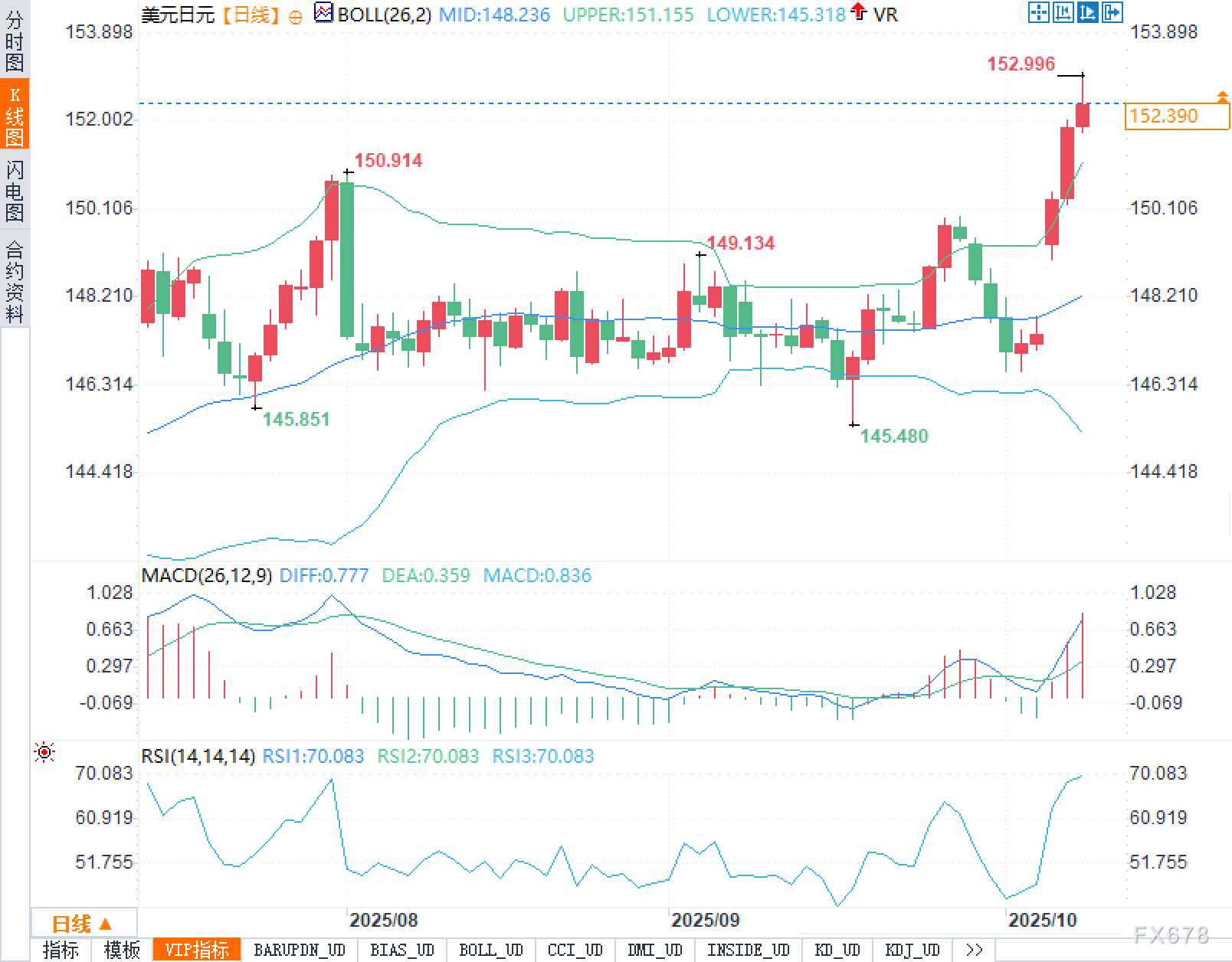 短线:若汇价在152.996—153.00上方获得有效站稳,并伴随布林带继续扩张与MACD柱状图延续放大,多头目标将转向154—155区间。若未能上破并出现长上影线,RSI的超买状态倾向触发回撤,参考回测位依次为151.155、150.914与148.236,技术性回撤后再行择向的概率较高。